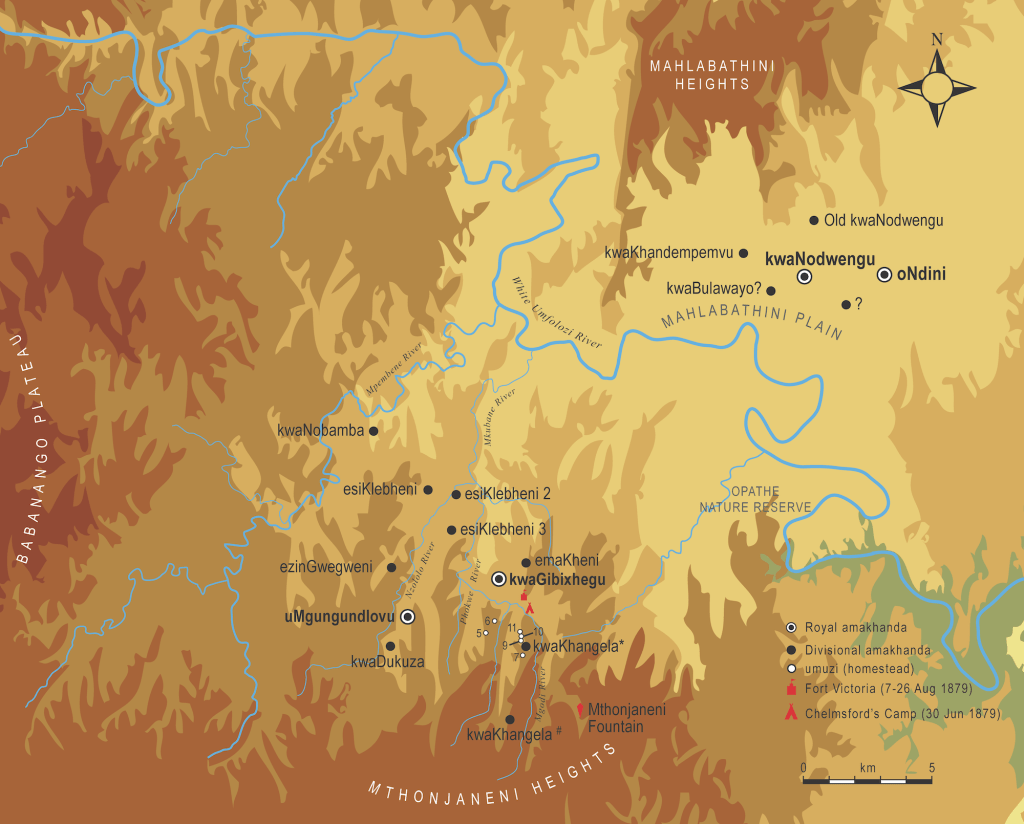 For this phase of research (2020-2026), we are concentrating our attention on the emaKhosini, the homeland of the Zulu chiefdom and heartland of the Zulu Kingdom (see map). The emaKhosini is an ancient basin of rolling terrain bound by an arc of high hills to the southwest and the White uMfolozi River to the northeast. The emaKhosini and the Mahlabathini Plain across the river was the area where Shaka kaSenzangakona replaced his father as chief of the Zulu, founded the expansion and consolidation of the kingdom, where subsequent kings established their capitals, and where, in June of 1879, the kingdom was subjugated by British forces (Battle of Ulundi), ending its existence as an independent African polity.